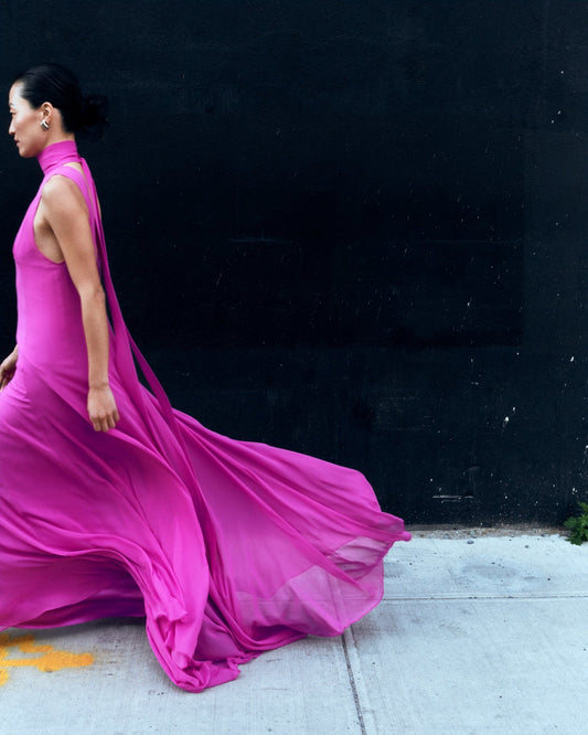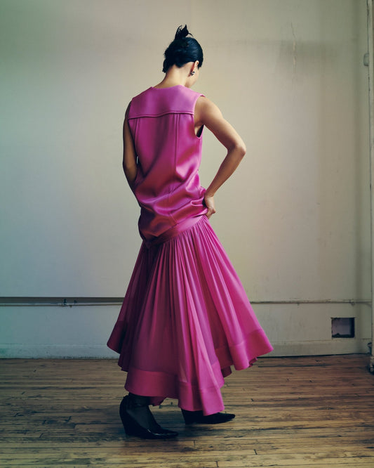 Deep U-Neck Dress with Gathered Chiffon Skirt - Fuchsia