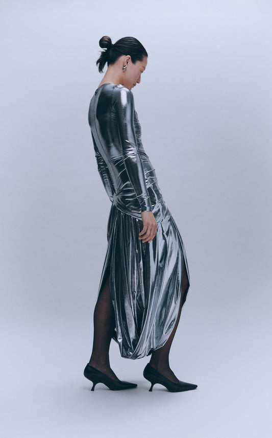 • Kara Ruched Cami Dress Sheer Metallic Knit