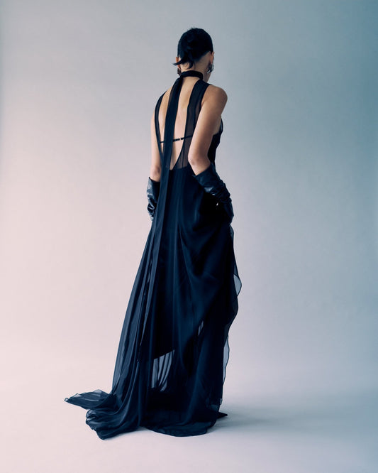 Deep U-Neck Dress with Gathered Chiffon Skirt - Black